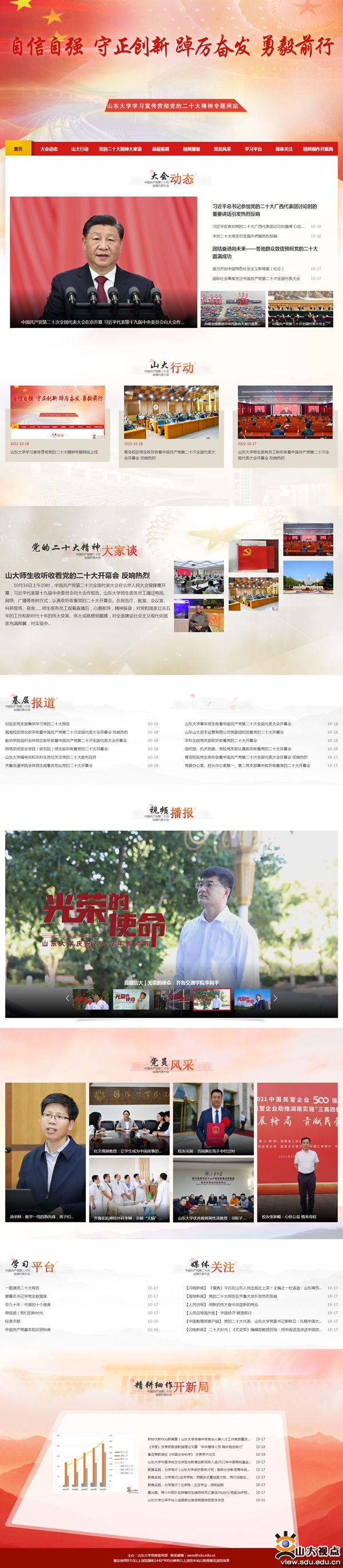 网站分为“大会动态”“山大行动”“基层报道”“党的二十大精神大家谈”“媒体关注”“视频播报”“党员风采”“学习平台”“精耕细作开新局”共9个版块。“大会动态”第一时间聚焦、关注党的二十大召开的动态新闻、重要讲话、中央精神等内容。“山大行动”及时发布学校学习宣传贯彻党的二十大精神的重要新闻。“基层报道”关注学校各基层单位学习宣传贯彻落实党的二十大精神的新闻动态。“党的二十大精神大家谈”发布师生医务员工关于党的二十大精神的解读、感悟文章和结合自身工作、学校建设、国家发展的学习践行作品。“媒体关注”转载各大媒体发布的山东大学学习宣传贯彻党的二十大精神的动态新闻。“视频播报”发布学校上下学习宣传贯彻党的二十大精神的相关视频新闻。“党员风采”集中展示学校优秀共产党员、优秀党务工作者等典型人物的先进事迹。“学习平台”及时发布权威媒体关于党的二十大精神的理论文章、专家观点、政策解读、理论评论等文章。“精耕细作开新局”主要报道学校近年来的建设发展成就和突出进展,以及各单位在党的二十大精神指引下谋篇布局、开启新征程的奋进历程。