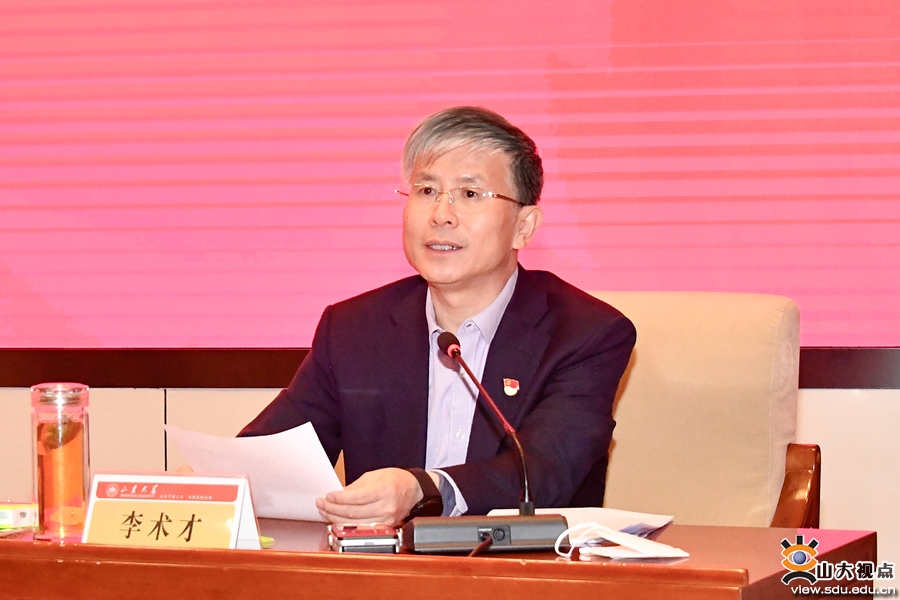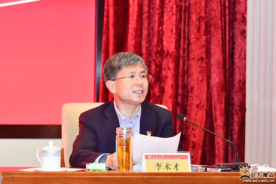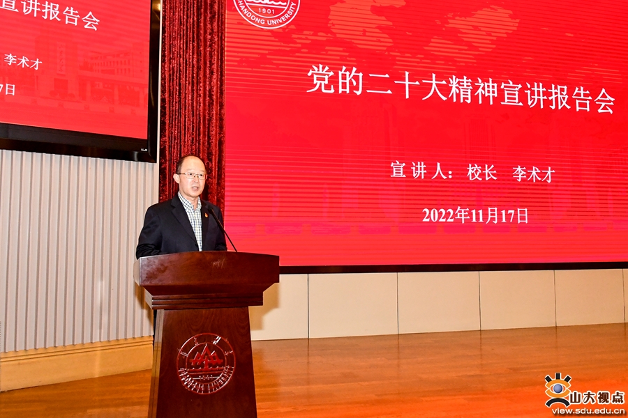 李术才强调,山东大学作为“双一流”建设高校,作为科技第一生产力、人才第一资源和创新第一动力的重要结合点,要把学习贯彻党的二十大精神同坚定捍卫“两个确立”、坚决做到“两个维护”紧密结合起来,始终心怀“国之大者”,以国家战略需求为导向,全面提升服务科教兴国、人才强国、创新驱动发展战略的能力和水平,为强化教育、科技、人才的基础性、战略性支撑作用贡献山大智慧和力量。一要深入落实立德树人根本任务,办好人民满意的教育。全面贯彻党的教育方针,落实“四为服务”,紧盯最优秀本科生和最具创造力研究生的育人目标,持续提升国家急需高层次人才培养质量。用习近平新时代中国特色社会主义思想铸魂育人,旗帜鲜明讲好思政课程,潜移默化做好课程思政,躬身实践办好思政教育;服务“国之大者”,以“新格局”对接需求,加快推进学科专业现代化升级,构建“点线面体”国家急需人才培养体系,打造“五堂一院”拔尖创新人才培养升级版;坚持“三新一高”,使“大发展”成为现实,加强“金专金课金教材”建设,深化融合育人工程,落实教育数字化战略,打造教育质量文化;践行“四有”好老师标准,培养高素质教师队伍,让“大先生”源源不断。二要健全完善学校科研创新体系,强力支撑科技强国建设。始终把服务国家作为最高追求,大力实施学术兴校战略。聚焦聚力高水平科技自立自强,遵循科技发展规律,树立质量和效率优先的科技发展理念,加强基础研究和“无人区”前沿探索,坚决打赢关键核心技术攻坚战,推进学科汇聚融合交叉;聚焦聚力构建中国自主的知识体系,加快打造习近平新时代中国特色社会主义思想研究重镇,为马克思主义中国化时代化注入新动能,积极探索中华优秀传统文化“两创”的“山大模式”,为坚守中华文化立场增强时代底蕴,扎实推进新型智库建设,为中国式现代化建设提供高水平智力支撑;聚焦聚力有组织科研,强化国家战略科技力量,深化科研评价机制改革,提升科技成果转化和产业化水平,拓展高水平国际科研交流合作。三要凝心聚力突出重点,攻坚打造一流人才队伍。大力实施人才强校战略,汇聚打造担当国家重任、站在国际前沿、引领自主创新的战略人才力量,推进更加积极、更加开放、更加有效的人事人才体制机制改革,构建尊重劳动、尊重人才、尊重知识、尊重创造的优质人才生态环境,大力弘扬科学家精神,增强真心爱才、悉心育才、倾心引才、精心用才的主动意识,不断强化“榜样就在身边、我也能成为榜样”的思想自觉和行动自觉,统筹推进学校、学院、学科三级人才文化建设,充分发挥典型经验和优秀人才的示范引领作用,努力将山东大学打造成各类人才向往的高地。