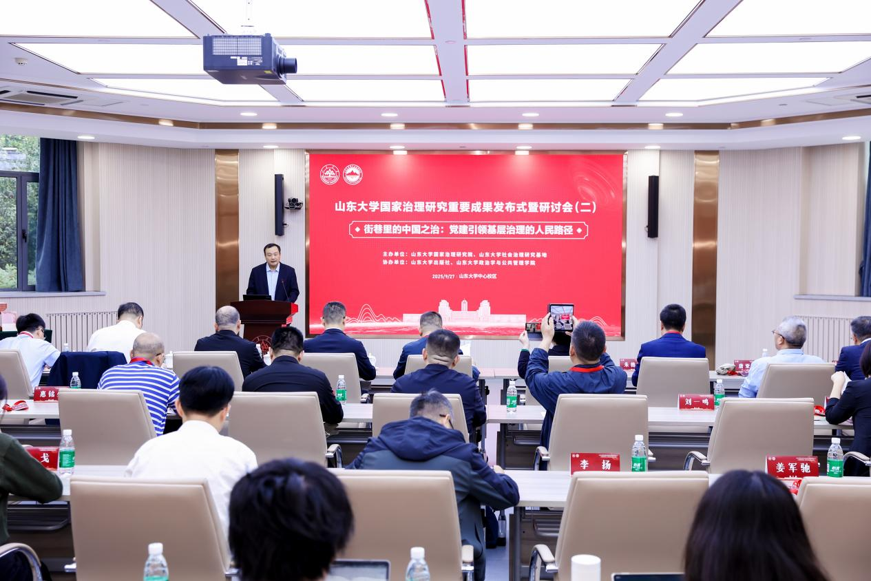 山东大学聚焦国家重大战略需求,服务地方经济社会发展,自2025年起连续举办“国家治理研究重要成果发布会”系列活动,旨在进一步深化研究年度具有较大社会影响力的重点项目成果,持续推进国家治理体系和治理能力现代化的经验总结与理论创新。本次会议由山东大学国家治理研究院、山东大学社会治理研究基地主办,山东大学出版社、山东大学政治学与公共管理学院协办,得到了中国社会科学报、山东广播电视台、大众日报、济南日报、《山东大学学报(哲学社会科学版)》《当代世界社会主义问题》《东岳论丛》等期刊和媒体的支持。来自尼山世界儒学中心、中国海洋大学等高校的专家学者,山东大学国家治理研究院、政治学与公共管理学院、经济学院等师生代表70余人参加会议。