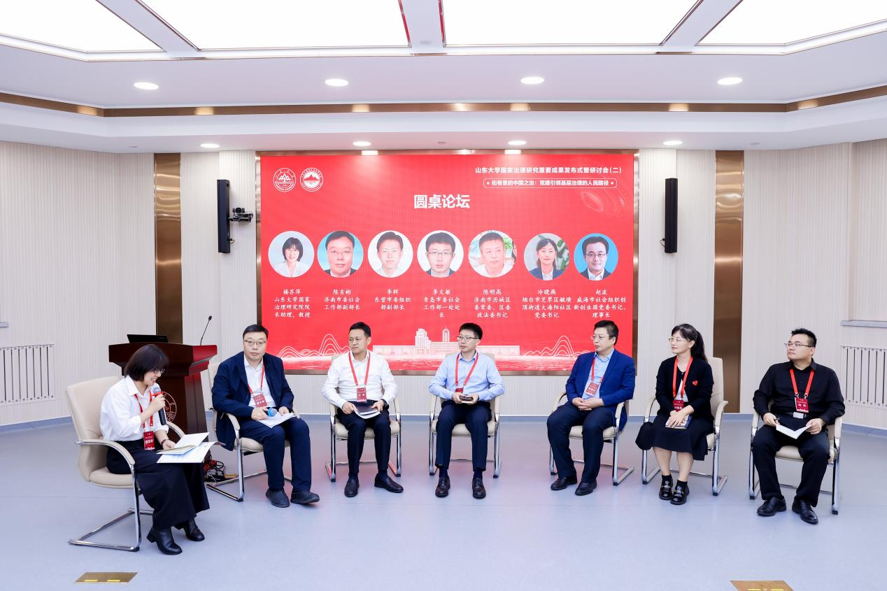 圆桌论坛环节,以“政策应用对话”为主题,济南市委社会工作部副部长陈吉彬,东营市委组织部副部长李群,青岛市委社会工作部一处处长李文敏,济南市历城区委常委、区委政法委书记陈明高,烟台市芝罘区毓璜顶街道大海阳社区党委书记冷晓燕,威海市社会组织创新创业园理事长赵波围绕“党建引领的效能提升”“社会工作部的成立与使命”“基层治理的重点工作内容”“社会组织的发展与创新”等议题展开讨论,一致认为新时代基层治理需坚持问题导向,通过制度创新与实践探索,激发多元主体活力,切实提升群众获得感、幸福感、安全感。本环节由山东大学国家治理研究院院长助理楼苏萍主持。